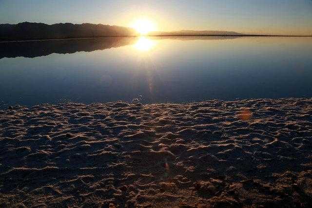 第二天清晨,我们赶到盐湖拍日出,太阳从山背后慢慢升起,褐红色的山影映在蔚蓝色的湖面上,色彩斑斓。霞光泼洒下来,洁白的岩滩也变成了暗红色和金黄色,远远的有几艘采盐船开进湖中采盐,新的一天开始了,茶卡盐湖里充满了生机,“盐湖催生中华文明,创造壮美风景”,从这个意义上说:“盐是一种景观”。